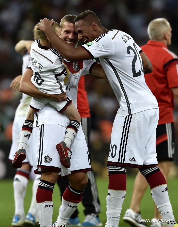 Germany's Lukas Podolski (L) carrying his son celebrates the victory with Jerome Boateng (R) after the final match between Germany and Argentina of 2014 FIFA World Cup at the Estadio do Maracana Stadium in Rio de Janeiro, Brazil, on July 13, 2014. Germany won 1-0 over Argentina after 120 minutes and took its fourth World Cup title on Sunday. (Xinhua/Qi Heng) |