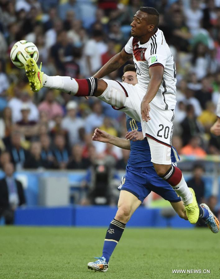 Germany's Jerome Boateng (front) controls the ball against Argentina's Lionel Messi during the final match between Germany and Argentina of 2014 FIFA World Cup at the Estadio do Maracana Stadium in Rio de Janeiro, Brazil, on July 13, 2014. (Xinhua/Yang Lei) |
