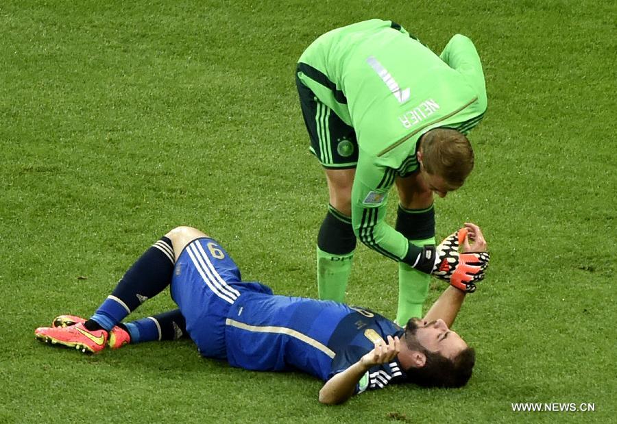 Germany's goalkeeper Manuel Neuer comforts Argentina's Gonzalo Higuain after their collision during the final match between Germany and Argentina of 2014 FIFA World Cup at the Estadio do Maracana Stadium in Rio de Janeiro, Brazil, on July 13, 2014. (Xinhua/Lui Siu Wai) |