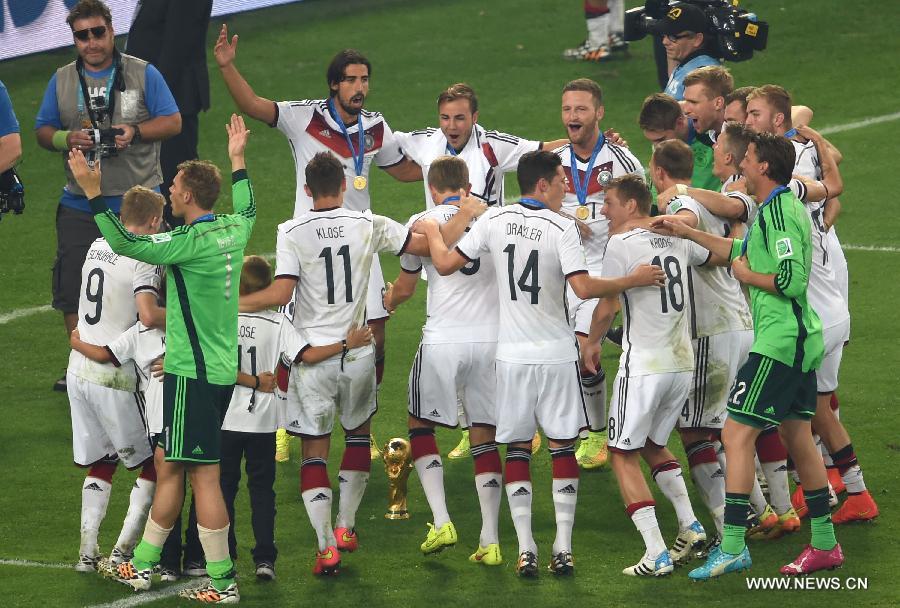 Germany's players celebrate around the FIFA World Cup trophy after the final match between Germany and Argentina of 2014 FIFA World Cup at the Estadio do Maracana Stadium in Rio de Janeiro, Brazil, on July 13, 2014. Germany won 1-0 over Argentina after 120 minutes and took its fourth World Cup title on Sunday. (Xinhua/Liu Dawei) |