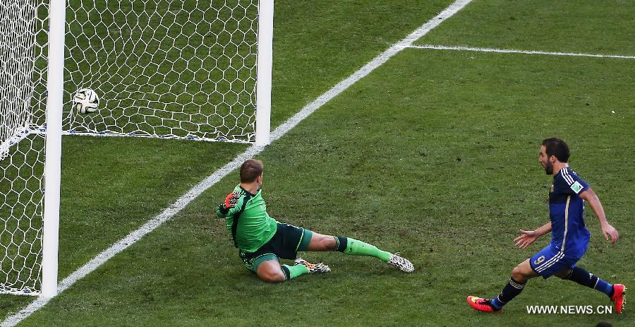Argentina's Gonzalo Higuain (R) scores a goal which is later nullified for his offside foul during the final match between Germany and Argentina of 2014 FIFA World Cup at the Estadio do Maracana Stadium in Rio de Janeiro, Brazil, on July 13, 2014. (Xinhua/Zhou Lei) |