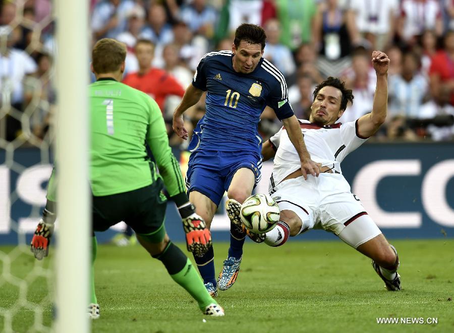 Germany's Mats Hummels (R) and goalkeeper Manuel Neuer (L) defend against Argentina's Lionel Messi during the final match between Germany and Argentina of 2014 FIFA World Cup at the Estadio do Maracana Stadium in Rio de Janeiro, Brazil, on July 13, 2014. (Xinhua/Qi Heng) |