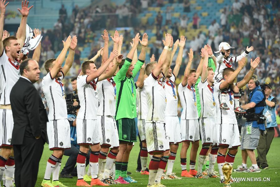 Germany's players applaud fans as the FIFA World Cup trophy is seen placed in front of them after the final match between Germany and Argentina of 2014 FIFA World Cup at the Estadio do Maracana Stadium in Rio de Janeiro, Brazil, on July 13, 2014. Germany won 1-0 over Argentina after 120 minutes and took its fourth World Cup title on Sunday. (Xinhua/Liu Dawei) |