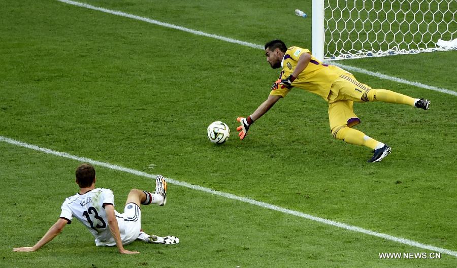 Argentina's goalkeeper Sergio Romero defends against Germany's Thomas Muller during the final match between Germany and Argentina of 2014 FIFA World Cup at the Estadio do Maracana Stadium in Rio de Janeiro, Brazil, on July 13, 2014. (Xinhua/Lui Siu Wai) |
