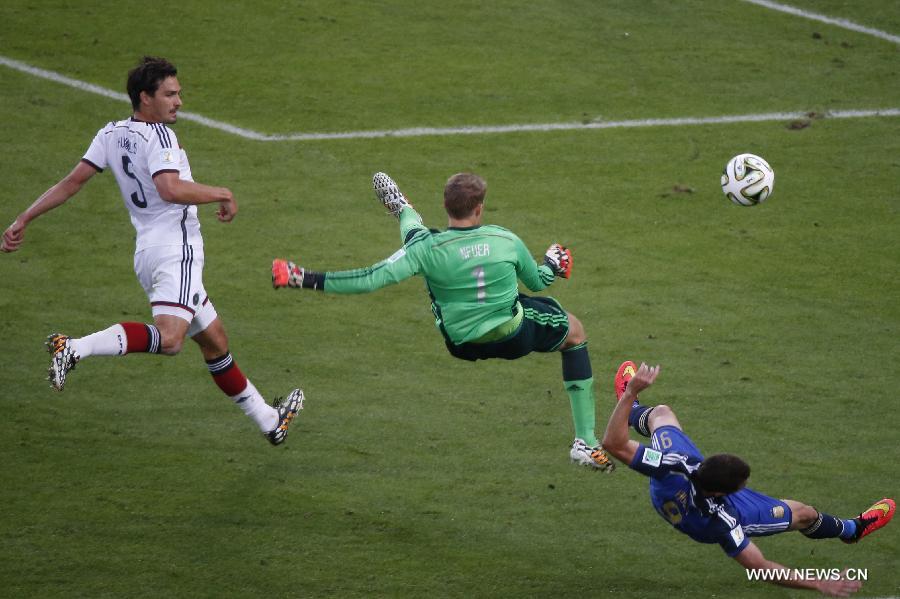 Germany's goalkeeper Manuel Neuer (C) vies with Argentina's Gonzalo Higuain (R) during the final match between Germany and Argentina of 2014 FIFA World Cup at the Estadio do Maracana Stadium in Rio de Janeiro, Brazil, on July 13, 2014.(Xinhua/Liao Yujie) |
