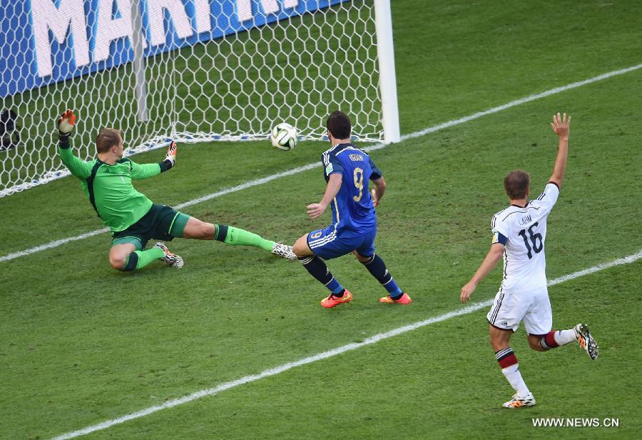 Argentina's Gonzalo Higuain (C) scores a goal which is later nullified for his offside foul during the final match between Germany and Argentina of 2014 FIFA World Cup at the Estadio do Maracana Stadium in Rio de Janeiro, Brazil, on July 13, 2014. (Xinhua/Li Ga) |