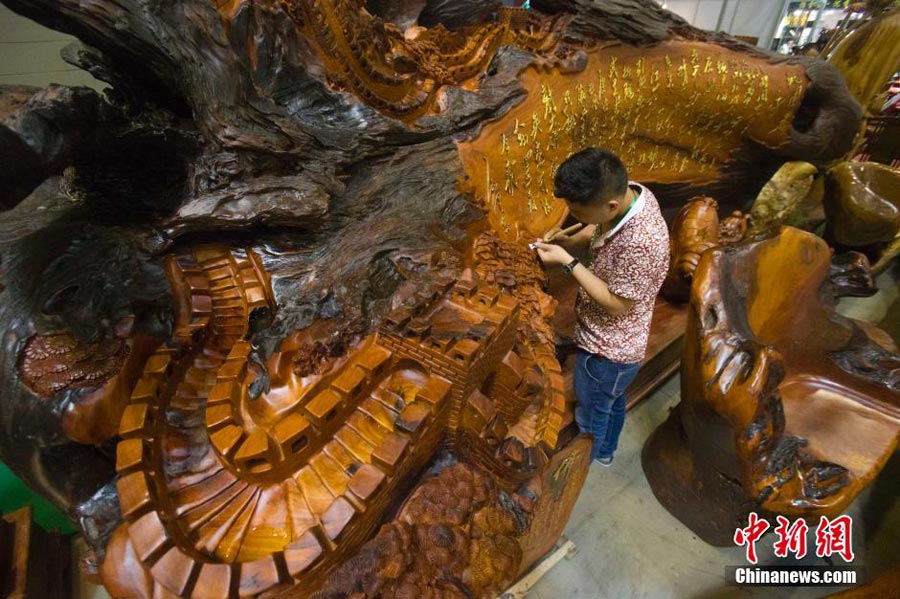 A giant root carving with Chairman Mao Zedong's poem, the Great Wall, pine and cypress trees, etc. is for sale at the price of 12 million yuan. It took 10 craftsmen a year to finish the 6 meters long, 2.5 meters tall and 1.5 meters wide work. (China News Service/Zhang Yun)
