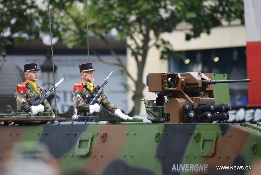 Soldiers of the tank regiment participate in the annual Bastille Day military parade on the Champs Elysees Avenue in Paris, France, on July 14, 2014. France celebrated National Day with a grand parade, which was participated by troops from 80 nations. (Xinhua/Li Genxing) |
