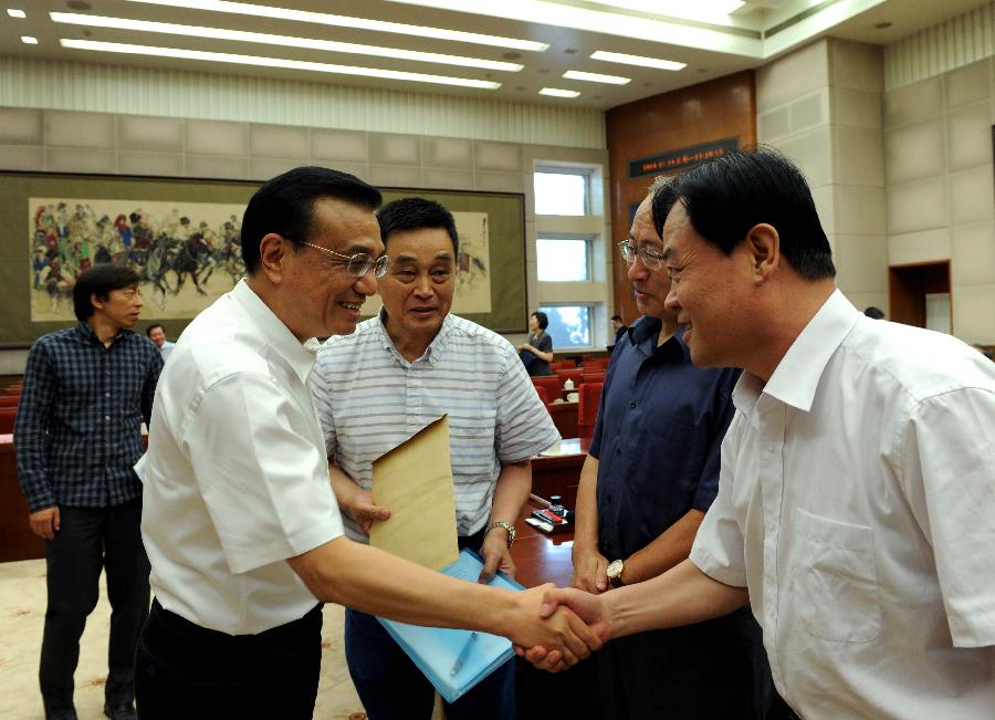 Chinese Premier Li Keqiang shakes hands with a businessman during a symposium attended by the country's leading businessmen from sectors including foreign trade, construction, finance and the Internet in Beijing, capital of China, July 14, 2014. (Xinhua/Rao Aimin) |