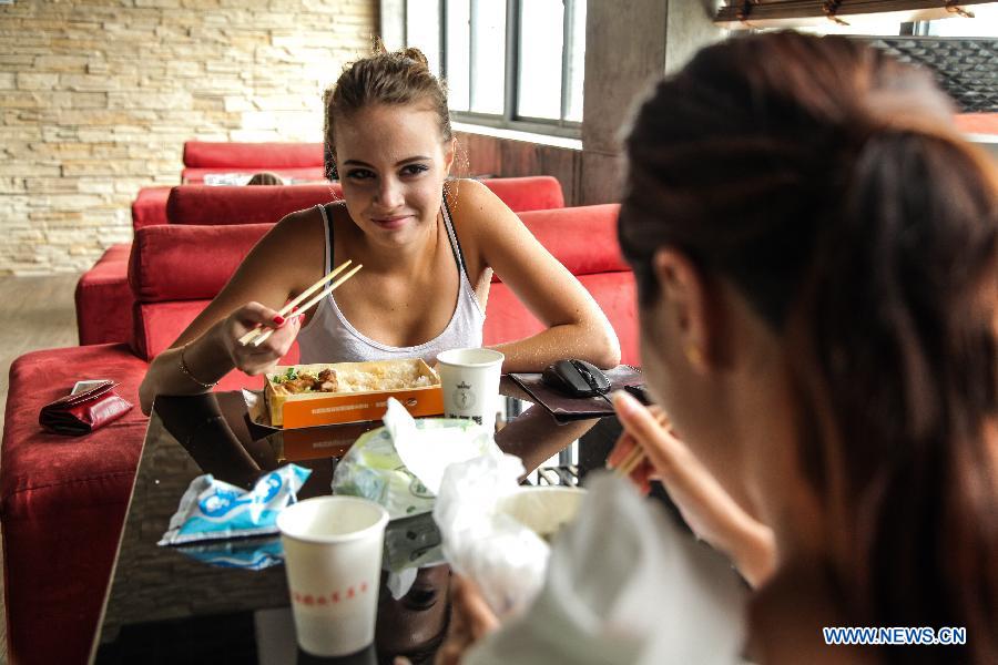 Slovakian model Patricia has a working meal while taking a break in Puyuan Township of Tongxiang City, east China's Zhejiang Province, July 14, 2014. As a junior model, she is paid 2,000 RMB yuan (322 U.S dollars) per day. With the booming development of woollen garment industry in Puyuan, many foreigners were attracted here and work as fashion models to earn their living. At present, over 100 foreigners are active models in the township, who come from at least 20 countries. In 2013, the annual turnover of woollen garment in Puyuan reached 23 billion RMB yuan (3.71 billion U.S. dollars), accounting for 60 percent of the market nationwide. (Xinhua/Xu Yu) |
