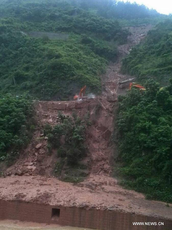 Photo taken by a mobile phone shows the mudslide in Xinzhan Township, Tongzi County, southwest China's Guizhou Province, July 15, 2014. A rain-triggered landslide on Monday affected train services between Guizhou and Sichuan provinces. Fourteen trains were canceled after the landslide hit the railway section between the stations of Taibai and Mengdu in the city of Zunyi. (Xinhua/Jiang Longrong) |