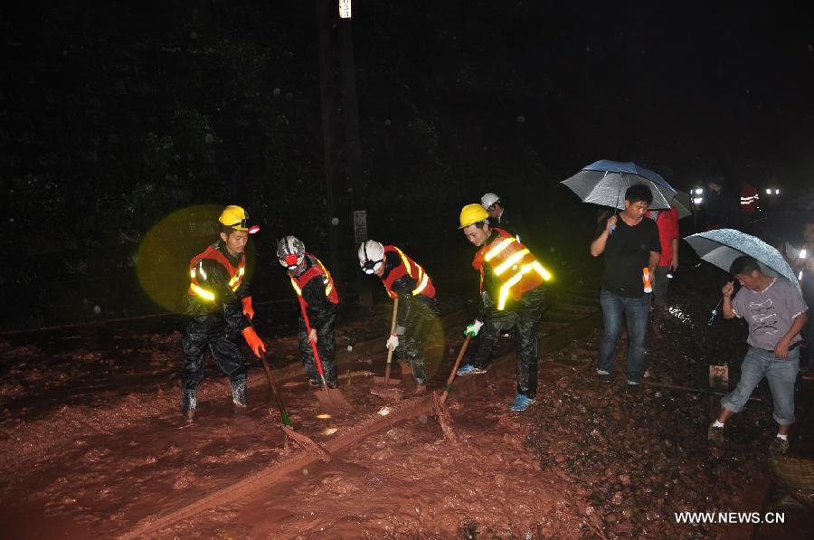 Workers clear mud off the railway in Xinzhan Township, Tongzi County, southwest China's Guizhou Province, July 15, 2014. A rain-triggered landslide on Monday affected train services between Guizhou and Sichuan provinces. Fourteen trains were canceled after the landslide hit the railway section between the stations of Taibai and Mengdu in the city of Zunyi. (Xinhua/Jiang Longrong) |