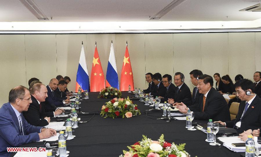 Chinese President Xi Jinping meets with Russian President Vladimir Putin in Fortaleza, Brazil, July 14, 2014. (Xinhua/Li Xueren)