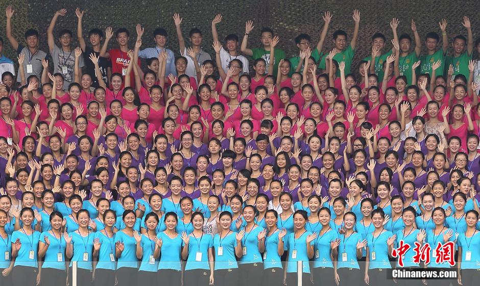 Volunteers for the 2014 Nanjing Youth Olympic Games pose for a group photo on July 13, 2014. On July 13, 491 ceremony volunteers for the 2014 Nanjing Youth Olympic Games make public appearance. All of them are from 18 colleges including Southeast University, Nanjing Agriculture University and Nanjing Sport Institute. (CNS/Yang Bo) |