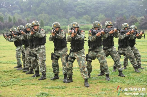 On July 12, 2014, soldiers of the People's Armed Police Force receive training in the rain in Nanjing, east China's Jiangsu Province. The training aims to temper their willpower and help them make good preparations for the security work of the Nanjing 2014 Youth Olympic Games. (Photo/XHBY.NET) |
