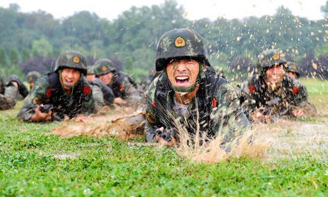 On July 12, 2014, soldiers of the People's Armed Police Force receive training in the rain in Nanjing, east China's Jiangsu Province. The training aims to temper their willpower and help them make good preparations for the security work of the Nanjing 2014 Youth Olympic Games. (Photo/XHBY.NET) |
