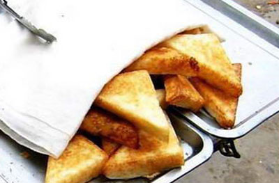 The Triangular Cake is a unique delicacy in some areas of the Simao Prefecture, including Jingdong, Zhenyuan, Jinggu, Mojiang, and Simao. It tastes soft in the mouth, glutinous but not greasy. This food is prepared as follows: use glutinous rice to make gluten; use ham, fresh meat, chopped Chinese chive, and other materials to prepare a salty filling or use sugar, honey, walnut, peanut, sesame, and cockscomb seed oil to prepare a sweet filling; use the gluten to wrap the filling and use three fingers to give what is formed a triangular shape, like a water caltrop; put the gluten pieces in a steamer with a layer of banana leaf placed on its top; steam the gluten pieces until it is well cooked.