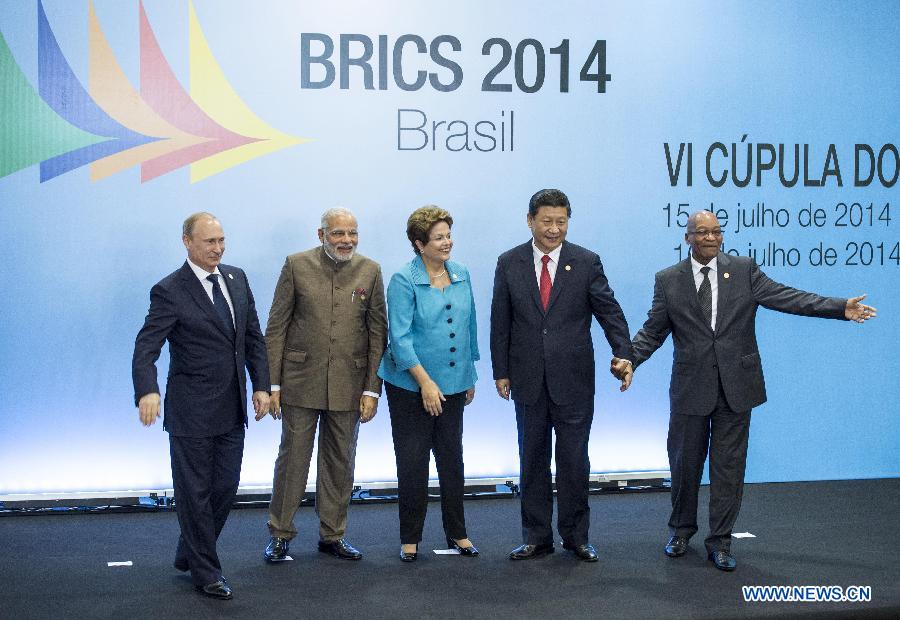 Chinese President Xi Jinping (2nd R) poses for a group photo with Russian President Vladimir Putin (1st L), Indian Prime Minister Narendra Modi (2nd L), Brazilian President Dilma Rousseff (C), and South African President Jacob Zuma during the sixth BRICS summit in Fortaleza, Brazil, July 15, 2014. (Xinhua/Wang Ye)