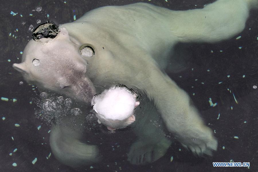 Polar bear Tonki enjoys food at the Everland Amusement Park in Yongin, Gyeonggi province, Korea, July 17, 2014. The polar bear is given special iced treats by zoo keepers during the hot summer. (Xinhua/Park Jin-hee)