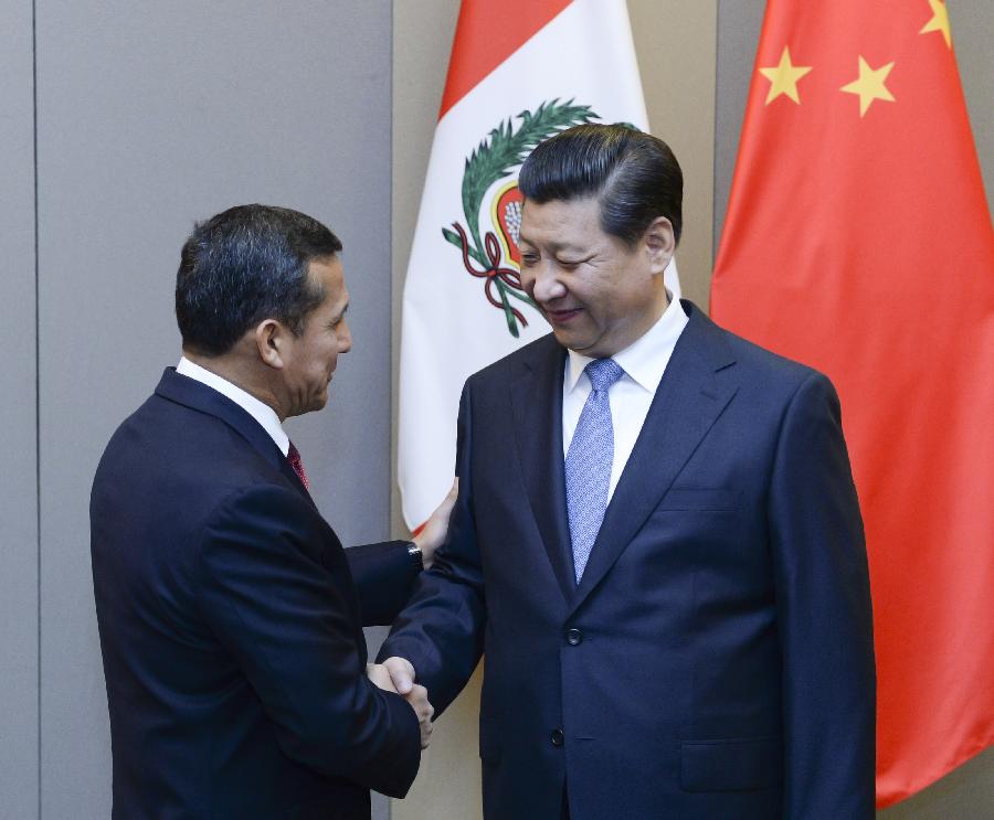 Chinese President Xi Jinping (R) meets with Peruvian President Ollanta Humala in Brasilia, Brazil, July 16, 2014. (Xinhua/Liu Jiansheng)