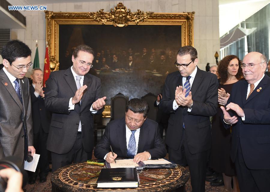 Chinese President Xi Jinping (C) signs a guest book during his meeting with Brazilian Senate President Renan Calheiros (2nd L, front) and President of the Chamber of Deputies Henrique Eduardo Alves (2nd R, front), in Brasilia, Brazil, July 16, 2014. (Xinhua/Li Xueren) |