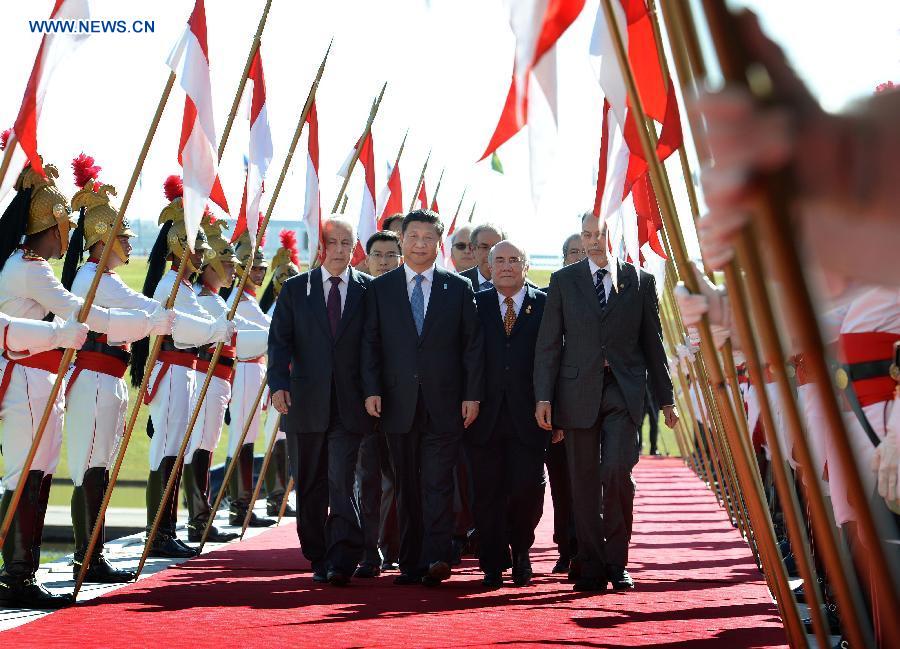 Chinese President Xi Jinping arrives at the National Congress in Brasilia, Brazil, on July 16, 2014. Xi on Wednesday met with Brazilian Senate President Renan Calheiros and President of the Chamber of Deputies Henrique Eduardo Alves in Brasilia. (Xinhua/Liu Jiansheng) |