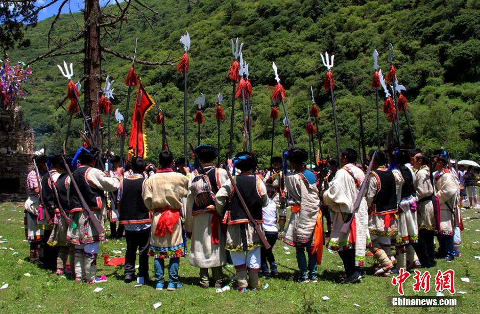 Qiang people hold a solemn ceremony of mountain offer on June 6 of the lunar calendar, praying for good weather and thanking God for blessing respectively in Mao county, Sichuan. The sacrifice event will last till June 27 in lunar calendar. (CNS/ He Qinghai) |