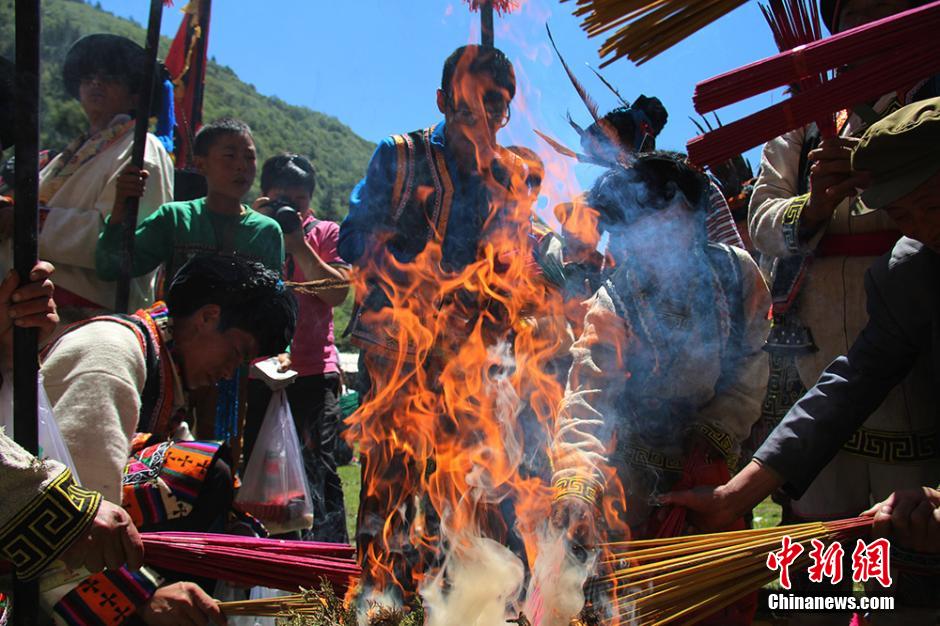 Qiang people hold a solemn ceremony of mountain offer on June 6 of the lunar calendar, praying for good weather and thanking God for blessing respectively in Mao county, Sichuan. The sacrifice event will last till June 27 in lunar calendar. (CNS/ He Qinghai) |