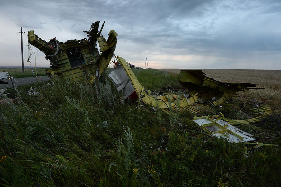 Photo taken on July 17, 2014 shows the debris at the crash site of a passenger plane near the village of Grabovo, Ukraine. A Malaysian flight crashed Thursday in eastern Ukraine near the Russian border, with all the 280 passengers and 15 crew members on board reportedly having been killed. (Xinhua/RIA Novosti)