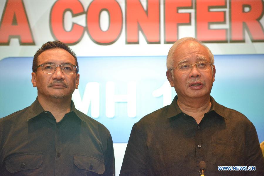 Malaysian Prime Minister Najib Razak (R) and Malaysian Defense Minister Hishamuddin Tun Hussein attend a press conference at a hotel at the Kuala Lumpur International Airport, in Kuala Lumpur, Malaysia, July 18, 2014. Malaysian Prime Minister Najib Razak said here Friday at a press conference that the MH17's flight route was declared safe by the International Civil Aviation Organization (ICAO), adding that the International Air Transportation Association had stated that the airspace the aircraft was traversing was not subject to restrictions. (Xinhua/Chong Voon Chung) |