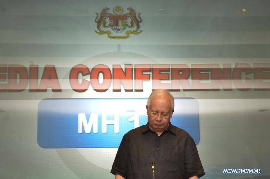 Malaysian Prime Minister Najib Razak speaks during a press conference at a hotel at the Kuala Lumpur International Airport, in Kuala Lumpur, Malaysia, July 18, 2014. Malaysian Prime Minister Najib Razak said here Friday at a press conference that the MH17's flight route was declared safe by the International Civil Aviation Organization (ICAO), adding that the International Air Transportation Association had stated that the airspace the aircraft was traversing was not subject to restrictions. (Xinhua/Chong Voon Chung) |