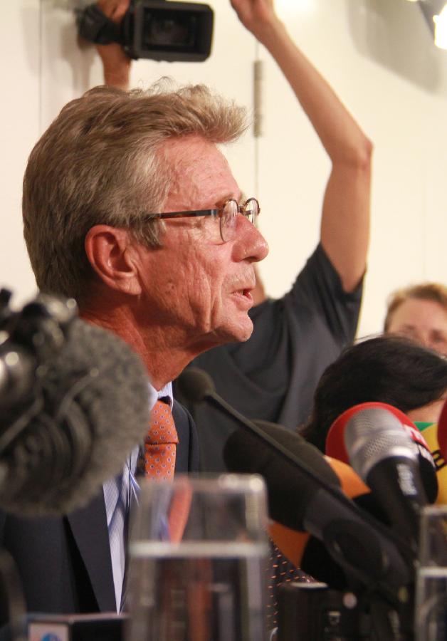 European Director of Malaysia Airlines Huib Gorter speaks at a press conference at the Schiphol Airport in Amsterdam, the Netherlands, on July 17, 2014. Dutch Prime Minister Mark Rutte said on Thursday that dozens of Dutch citizens might have been killed in the Malaysian passenger crash over the eastern part of Ukraine. (Xinhua/Pan Zhi)