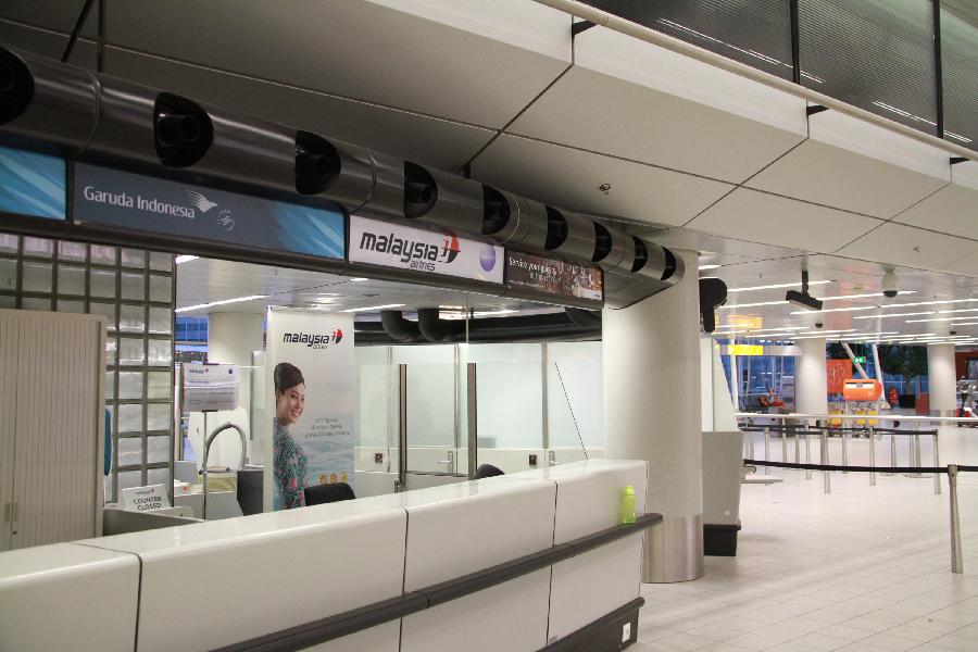 Photo taken on July 17, 2014 shows the counter of Malaysia Airlines at the Schiphol Airport in Amsterdam, the Netherlands. Dutch Prime Minister Mark Rutte said on Thursday that dozens of Dutch citizens might have been killed in the Malaysian passenger crash over the eastern part of Ukraine. (Xinhua/Pan Zhi) |