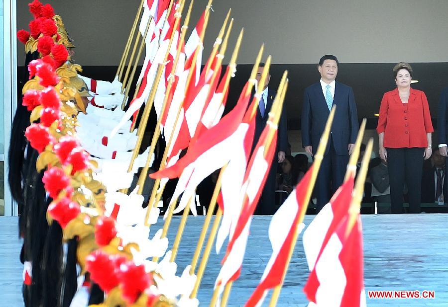Chinese President Xi Jinping (2nd R) attends a welcoming ceremony held for him by his Brazilian counterpart Dilma Rousseff (R) in Brasilia, Brazil, July 17, 2014. (Xinhua/Liu Jiansheng)