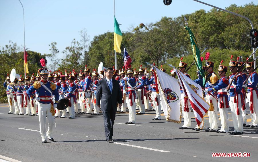 Chinese President Xi Jinping (C) attends a welcome ceremony held for him by his Brazilian counterpart Dilma Rousseff in Brasilia, Brazil, July 17, 2014. (Xinhua/Lan Hongguang)
