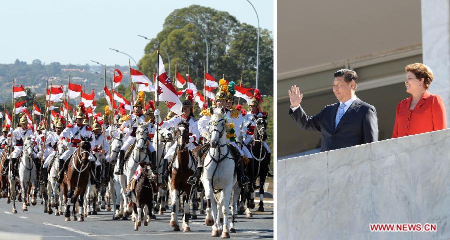 This combo photo taken on July 17, 2014 shows Chinese President Xi Jinping (2nd R) and his Brazilian counterpart Dilma Rousseff (R) reviewing an honor guard during a welcome ceremony held for him in Brasilia, Brazil. (Xinhua/Liu Jiansheng)