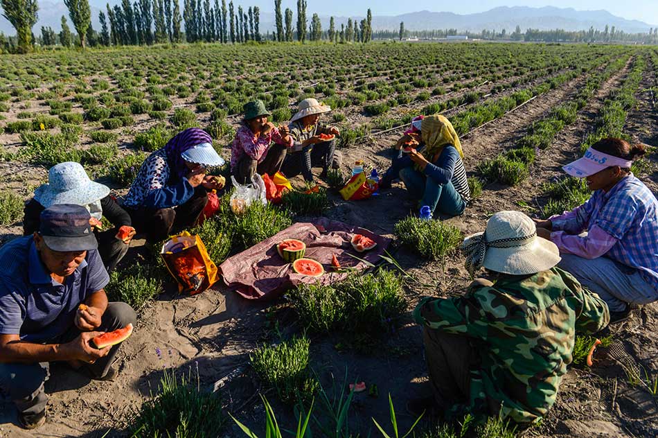 Farmers rest by the lavender field. (Photo/Xinhua)
