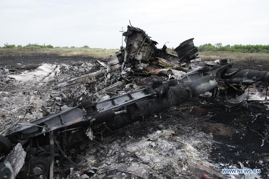 Photo taken on July 18, 2014 shows the debris of MH17 of Malaysian Airlines near the city of Shakhtarsk in Ukraine's Donetsk region. Malaysian Transport Minister Liow Tiong Lai said Friday that according to the International Civil Aviation Organization's Annex 13, the Ukrainian government should institute an investigation into the circumstances of the deadly MH17 incident, and be responsible for the conduct of the investigation. (Xinhua/Alexander Ermochenko) |