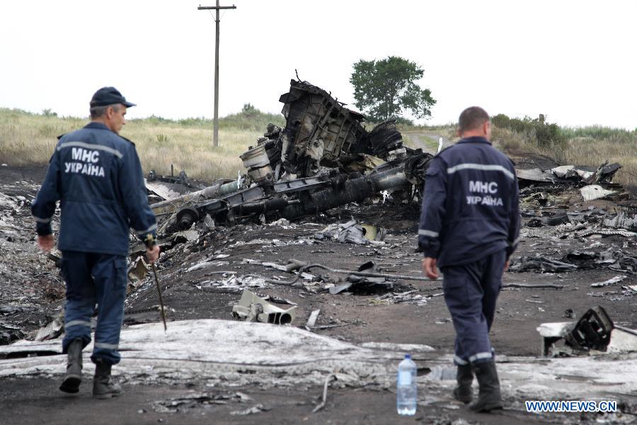 Rescuers work at the crash site of MH17 of Malaysian Airlines near the city of Shakhtarsk in Ukraine's Donetsk region, July 18, 2014. Malaysian Transport Minister Liow Tiong Lai said Friday that according to the International Civil Aviation Organization's Annex 13, the Ukrainian government should institute an investigation into the circumstances of the deadly MH17 incident, and be responsible for the conduct of the investigation. (Xinhua/Alexander Ermochenko) |