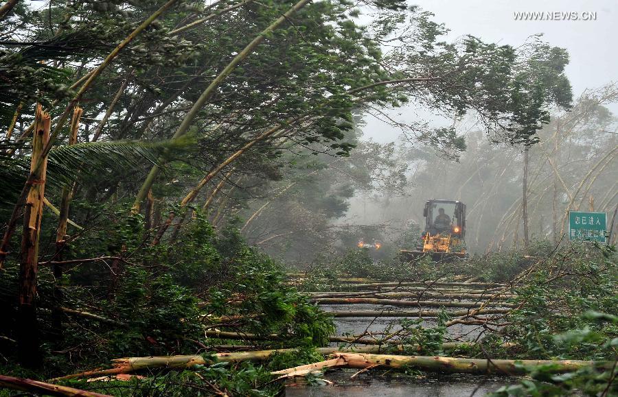 A municipal worker drives a bulldozer to clear broken trees off the road in Wenchang, south China's island of Hainan Province, July 18, 2014. A man was killed when super typhoon Rammasun made landfall in Wenchang on Friday afternoon. Rammasun is expected to be the strongest typhoon to hit Hainan Province in 40 years. (Xinhua/Guo Cheng) |