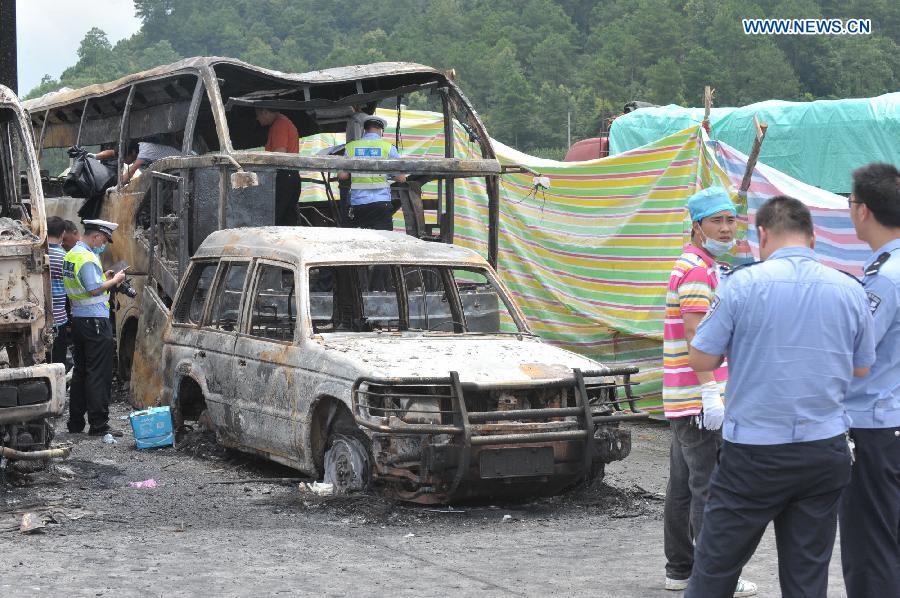Resucers work at the site of a traffic accident on a section of the Hukun (Shanghai to Kunming) Expressway in central China's Hunan Province, July 19, 2014. At least 38 people are confirmed dead and another five injured after a vehicle crash triggered fire and explosion on the highway early Saturday morning, police said. (Xinhua/Long Hongtao)