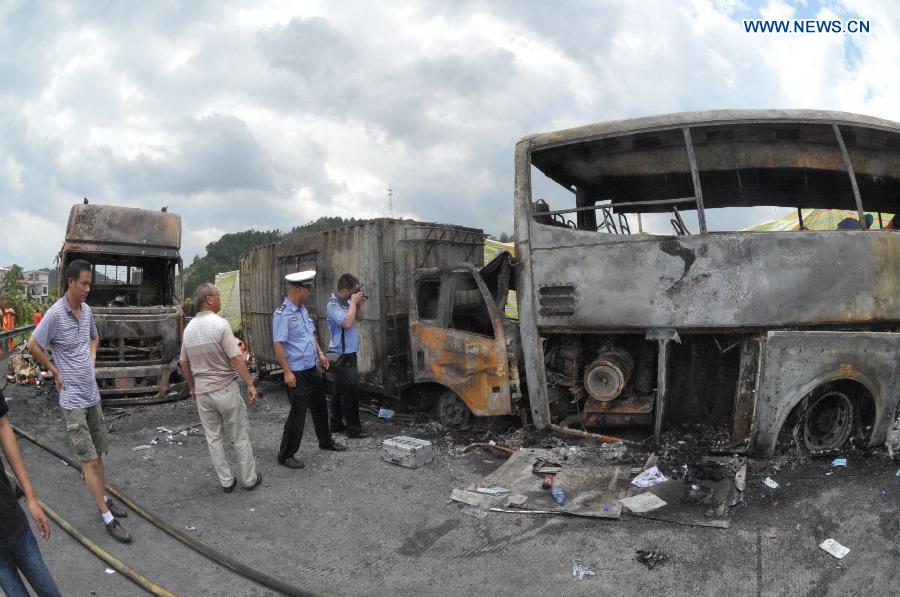 Resucers work at the site of a traffic accident on a section of the Hukun (Shanghai to Kunming) Expressway in central China's Hunan Province, July 19, 2014. At least 38 people are confirmed dead and another five injured after a vehicle crash triggered fire and explosion on the highway early Saturday morning, police said. (Xinhua/Long Hongtao)