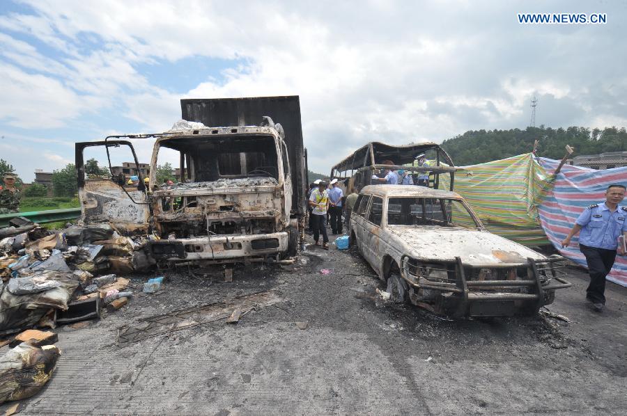 Resucers work at the site of a traffic accident on a section of the Hukun (Shanghai to Kunming) Expressway in central China's Hunan Province, July 19, 2014. At least 38 people are confirmed dead and another five injured after a vehicle crash triggered fire and explosion on the highway early Saturday morning, police said. (Xinhua/Long Hongtao)