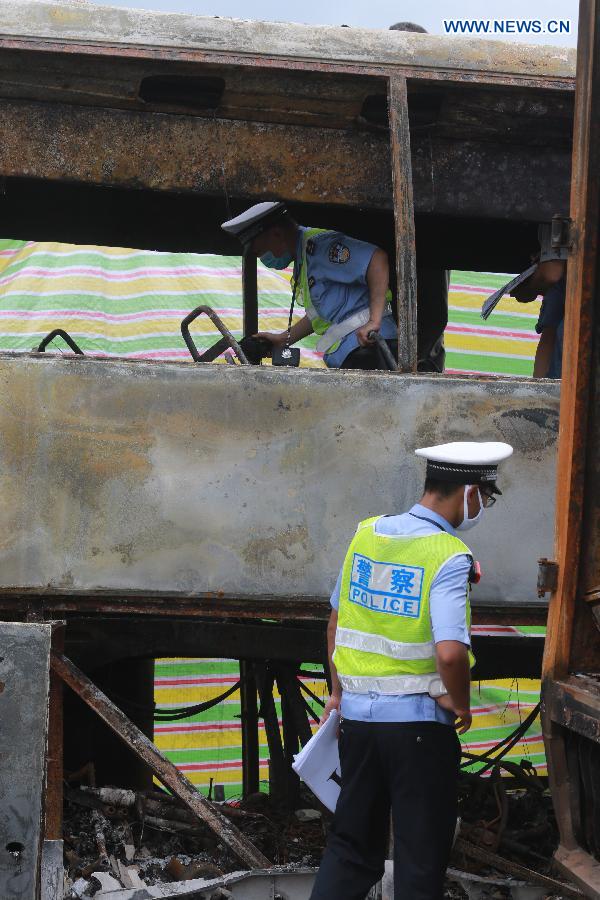 Police officers work at the site of a traffic accident on a section of the Hukun (Shanghai to Kunming) Expressway in central China's Hunan Province, July 19, 2014. At least 38 people are confirmed dead and another five injured after a vehicle crash triggered fire and explosion on the highway early Saturday morning, police said. (Xinhua) |