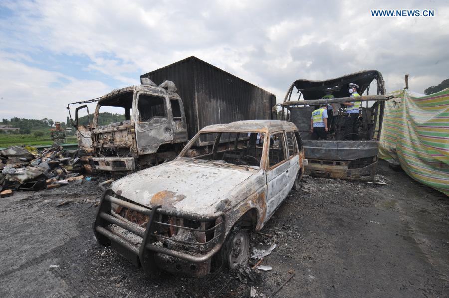 Resucers work at the site of a traffic accident on a section of the Hukun (Shanghai to Kunming) Expressway in central China's Hunan Province, July 19, 2014. At least 38 people are confirmed dead and another five injured after a vehicle crash triggered fire and explosion on the highway early Saturday morning, police said. (Xinhua/Long Hongtao)