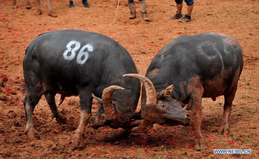 Chinese Bullfights are held during the Torch Festival of Yi ethnic group in Yi Autonomous County of Shilin, southwest China's Yunnan Province, on July 19,2014 (Source: xinhuanet.com)