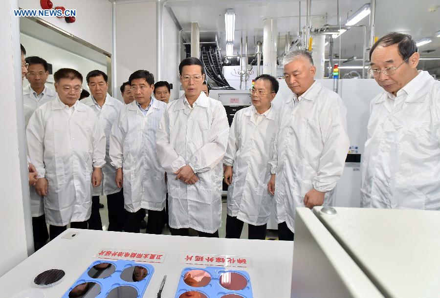 Chinese Vice Premier Zhang Gaoli (C), also a member of the Standing Committee of the Political Bureau of the Communist Party of China Central Committee, visits San'an Optoelectronics Co., Ltd. in Xiamen, southeast China's Fujian Province, July 17, 2014. Zhang Gaoli made an inspection tour in Fujian Province from July 17 to 19. (Xinhua/Li Tao) |