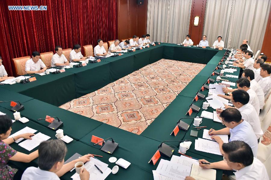 Chinese Vice Premier Zhang Gaoli (4th L), also a member of the Standing Committee of the Political Bureau of the Communist Party of China Central Committee, attends a symposium about developing Maritime Silk Road and accelerating the opening-up and economic development of Fujian in Fuzhou, capital of southeast China's Fujian Province, July 19, 2014. Zhang Gaoli made an inspection tour in Fujian Province from July 17 to 19. (Xinhua/Li Tao) |