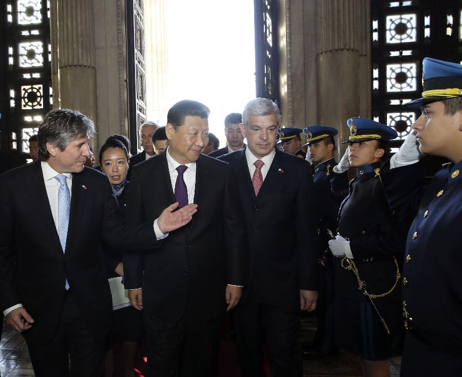 Chinese President Xi Jinping (2nd L, front) meets with Argentine Vice President and Senate President Amado Boudou (1st L, front) and Chamber of Deputies President Julian Dominguez (3rd L, front) in Buenos Aires, Argentina, July 19, 2014. (Xinhua/Ding Lin) |