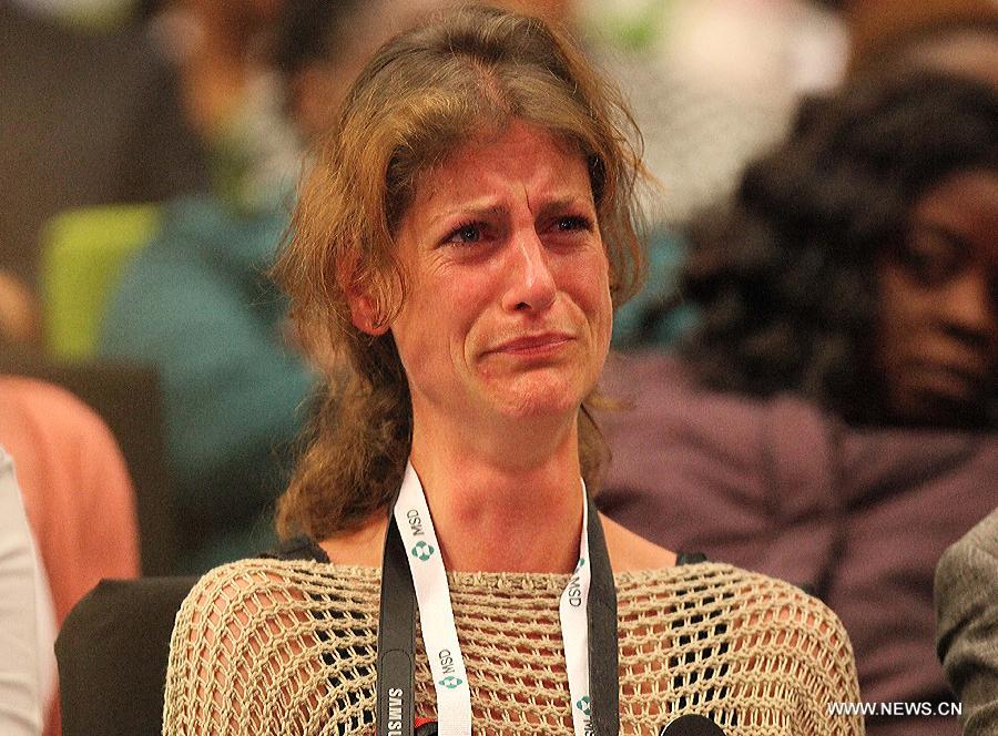 A conventioner reacts at a silent tribute during the opening of the 20th International AIDS Conference at the Melbourne Convention and Exhibition Centre (MCEC) in Melbourne, Australia, on July 20, 2014. At least six delegates heading for Melbourne to join the 20th international AIDS conference were killed in the crash of Malaysian flight MH17. (Xinhua/Xu Yanyan)